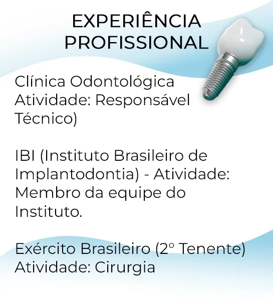- Local: IBI (Instituto Brasileiro de Implantodontia) – Atividade: Membro da equipe do Instituto.