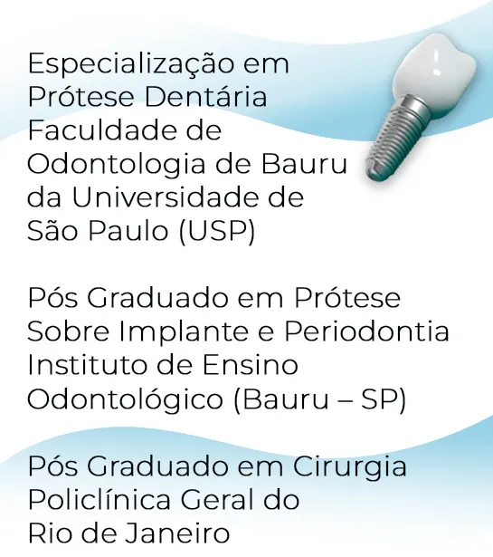 - Especialização em Prótese Dentária – Faculdade de Odontologia de Bauru da Universidade de São Paulo (USP)