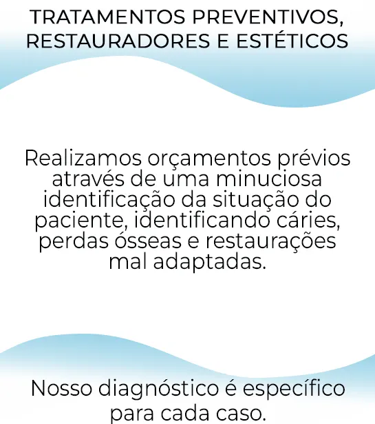 Tratamentos preventivos, restauradores e estéticos. Realizamos orçamentos prévios através de uma minuciosa identificação da situação do paciente, identificando cáries, perdas ósseas e restaurações mal adaptadas. Nosso diagnóstico é específico para cada caso.